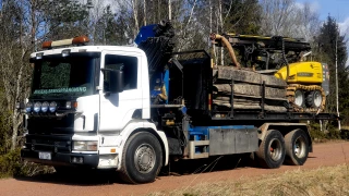 Vi transporterar våra maskiner till och från platsen där vi ska arbeta.
